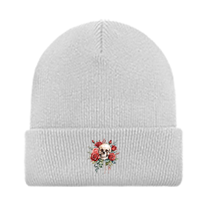 Stay warm and stylish with this grey beanie featuring an eye-catching skull and roses design. Perfect for infusing an edgy touch into your winter wardrobe.